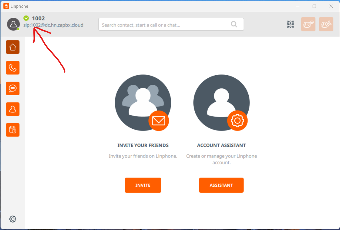 Ở hình 6 nếu bạn nhìn thấy dấu tích màu xanh theo chỉ dẫn mũi tên màu đỏ, có nghĩa là bạn đã cài đặt tài khoản máy nhánh trên phần mềm Linphone thành công. Bây giờ bạn có thể thực hiện cuộc gọi.